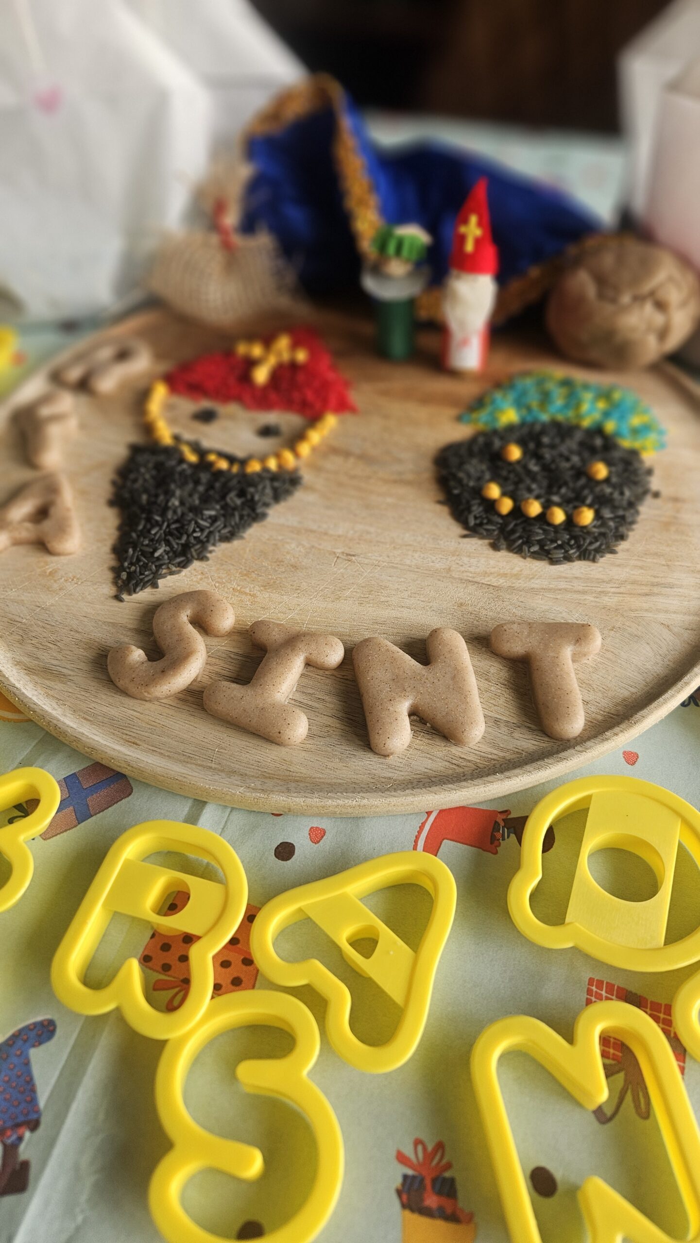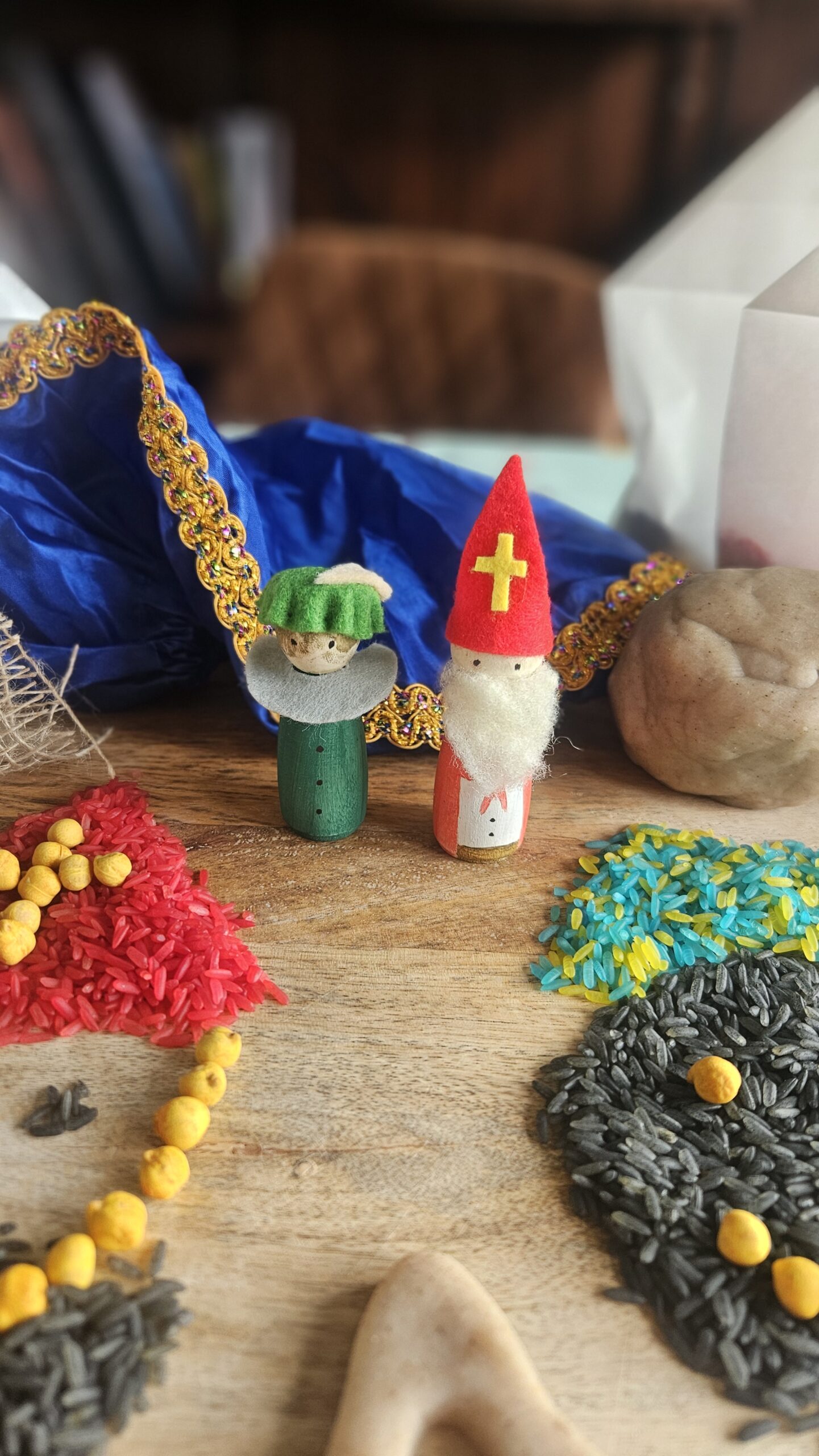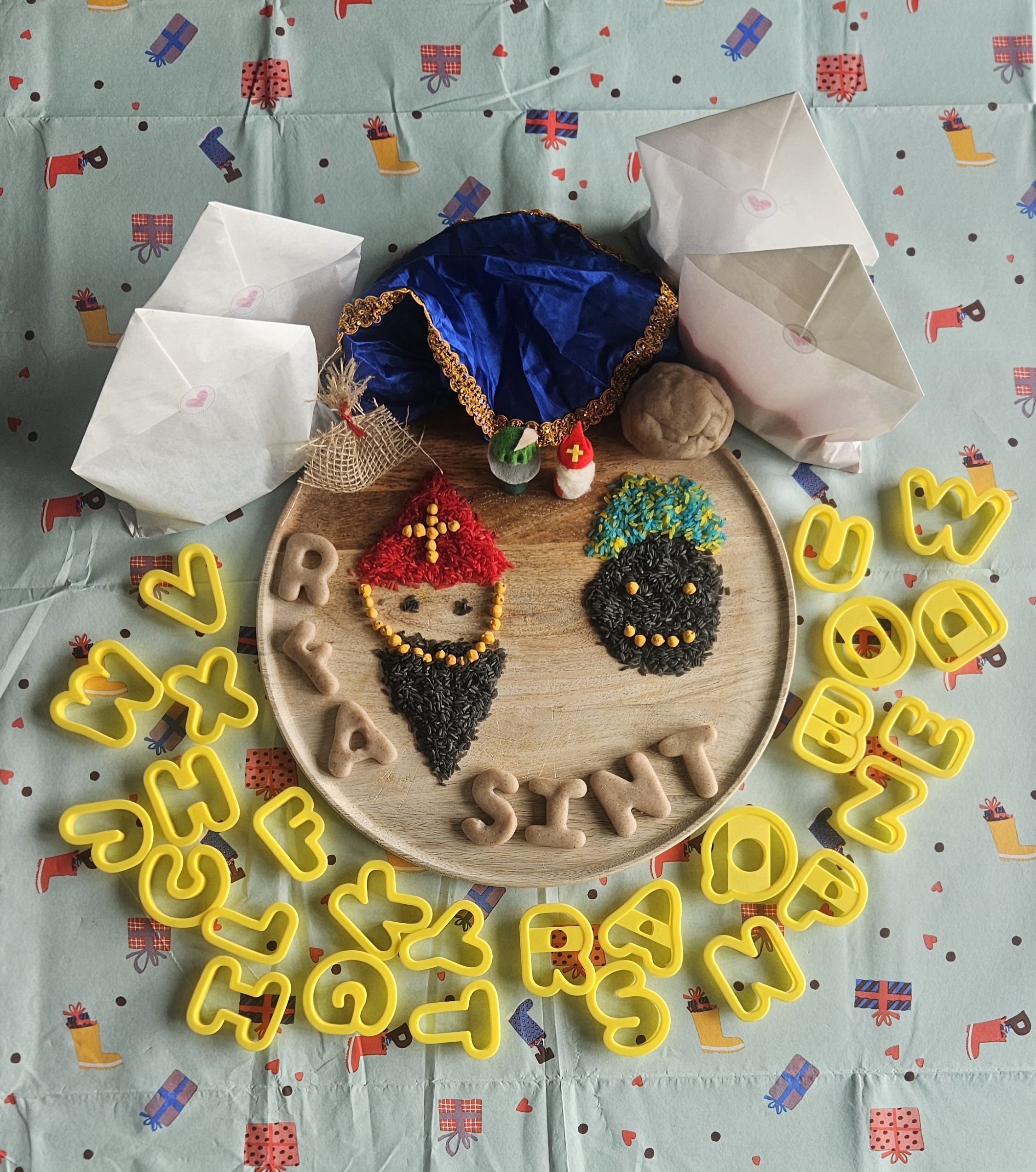 • Figuurtjes maken: Laat kinderen de speelrijst en kikkererwten gebruiken om figuren te vormen, zoals het gezicht van Sinterklaas of Piet, cadeautjes, de zak, een pietenmuts, enzoverder.