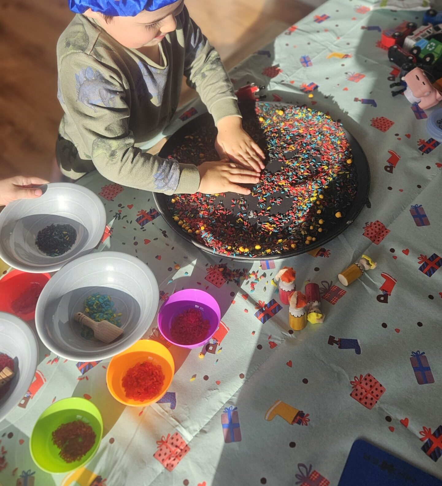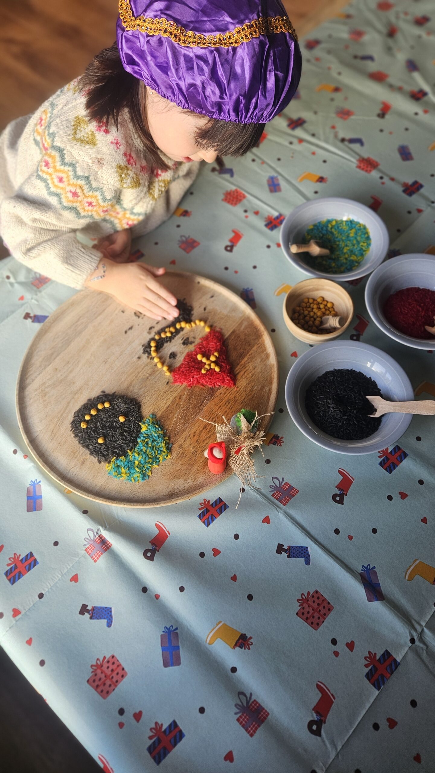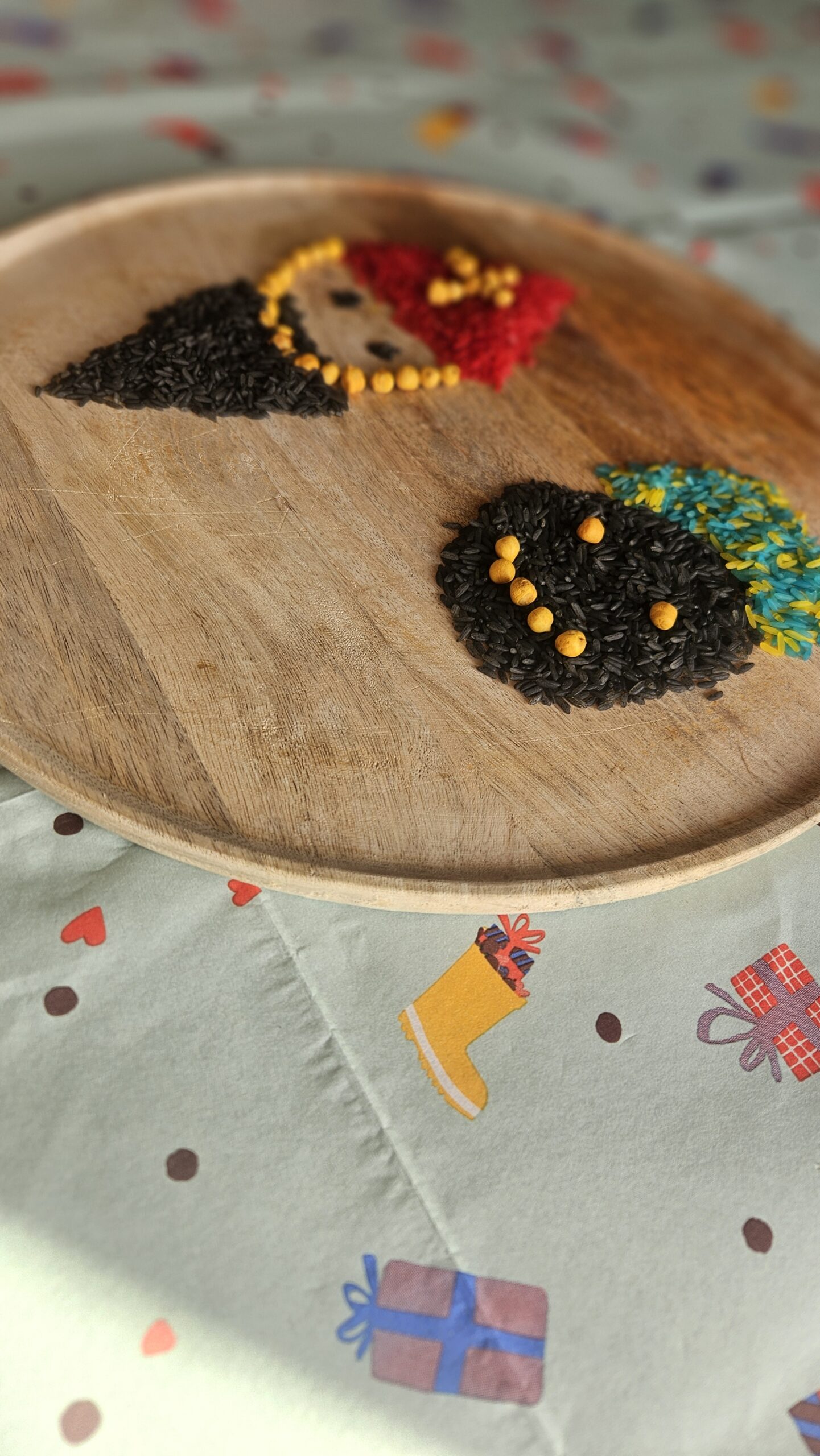 • Figuurtjes maken: Laat kinderen de speelrijst en kikkererwten gebruiken om figuren te vormen, zoals het gezicht van Sinterklaas of Piet, cadeautjes, de zak, een pietenmuts, enzoverder.